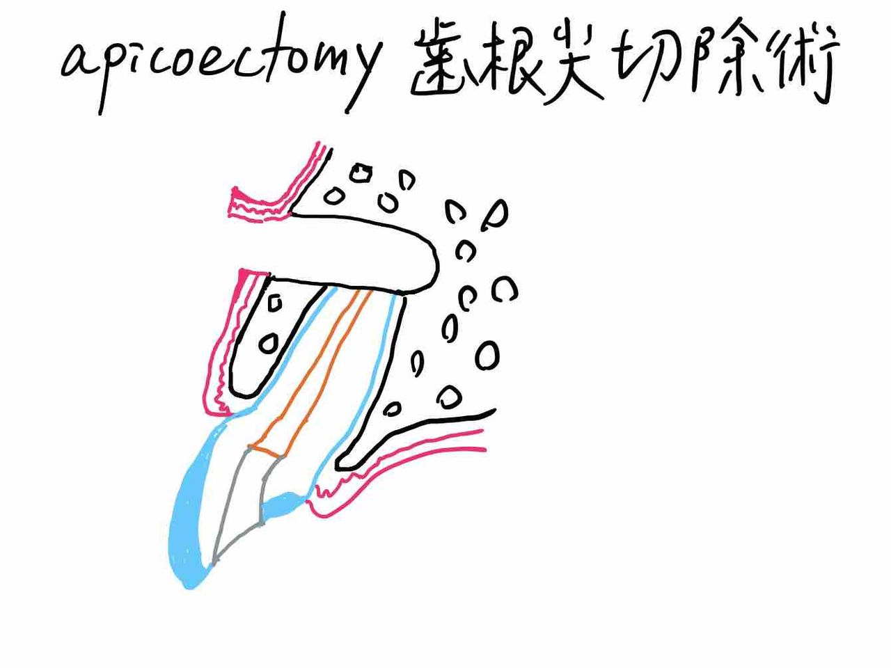 このような場合、抜歯を回避する手立てとして、根管治療が奏功しない歯根先端および周囲歯槽骨の病巣を外科的に取り除く治療法があり、歯根尖切除術(歯根端切除術)と呼んでいます。