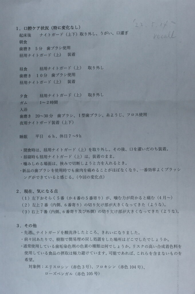 長期的健康維持を視野においたとき、この患者さんの問題点を挙げるとすれば、それはブラキシズムです。この11年間で、修復物の脱離や破折、歯牙歯頚部の楔状欠損および咬合面咬頭の破折等の問題が起きています。